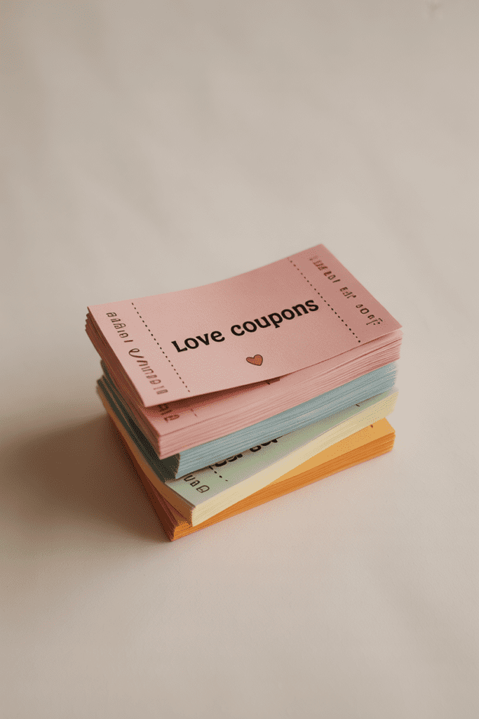 Design a set of coupons using colored cardstock or printable templates. Each coupon should offer something meaningful, like “One Free Backrub,” “Date Night of Your Choice,” or “A Day Without Chores.” You can even add cute illustrations or stickers to personalize them further.