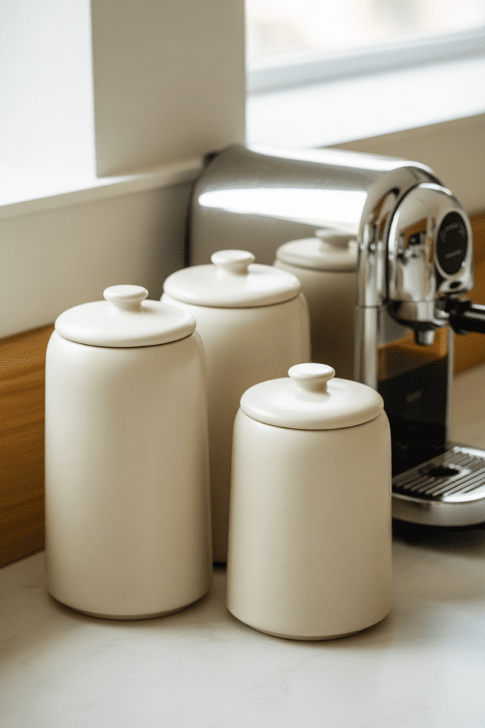 The fastest way to make a coffee bar feel messy is mismatched packaging—half-open coffee bags, sugar boxes, and a handful of pods in random containers. Matching canisters solve that instantly. A set of ceramic canisters in matte white, speckled cream, or soft stone tones looks far more expensive than it costs, and it gives your coffee station that calm, boutique café feel.