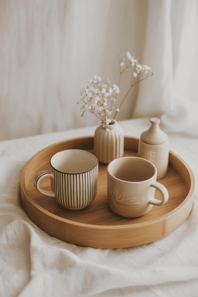 A tray creates instant structure. Instead of your coffee bar feeling like a collection of items, it becomes a single styled “zone.” That’s why a tray instantly elevates the space—it makes even everyday objects look curated. Light wood (bamboo, birch-toned, pale oak) feels especially spring-appropriate because it reflects light and brings warmth without going dark or heavy.