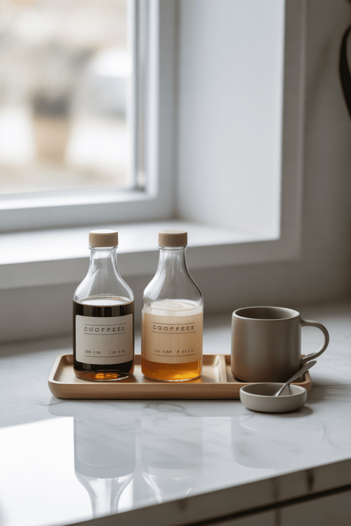 If you use flavored syrups or coffee add-ins, the original bottles can create visual noise. Decanting them into matching glass bottles creates a clean, upscale look instantly. Glass reflects spring light beautifully and adds that “fancy coffee shop” vibe—without changing what you buy.