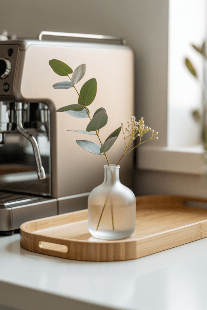 Choose a vase that blends in—matte white ceramic, warm beige, or clear glass. Keep it small enough that it doesn’t compete with your coffee machine. This is perfect if you’re decorating on a budget because you can clip greenery from the grocery store bouquet you’re already buying, or even use a realistic faux stem for a zero-maintenance option.