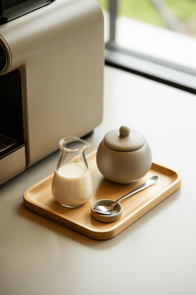 This is the most functional decor idea because it improves your daily routine while making the coffee bar look polished. A small creamer bottle (or mini carafe), a lidded sugar bowl, and a tiny dish for a spoon creates a true “station” that feels café-like and streamlined.