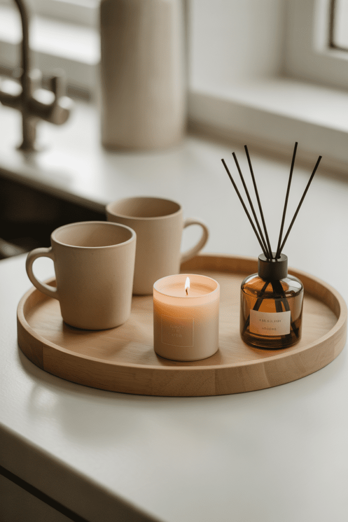 A coffee bar is a ritual space, not just a functional corner. Adding a candle or minimalist diffuser creates atmosphere and makes the area feel intentional—even when you’re rushing. In spring, lean into light, clean scents like linen, soft citrus, vanilla, almond, or subtle florals.