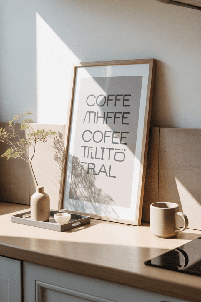 If you want your coffee bar to feel styled without adding more objects, add one piece of art. A printable in a simple frame is budget-friendly, renter-friendly, and incredibly effective at making the corner feel finished. Leaning it instead of hanging keeps the vibe relaxed and avoids wall damage.