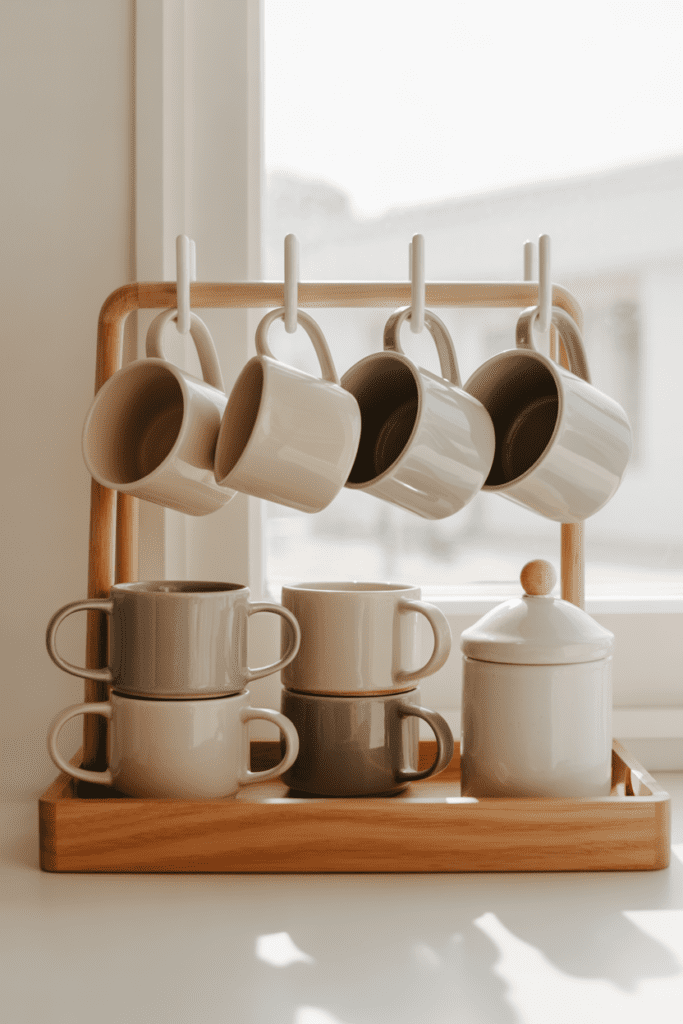 A coffee bar looks instantly calmer when the mugs match. Instead of displaying every mug you own, create a “capsule” of 3–6 neutral mugs in similar tones. When finishes and shapes are cohesive, the whole station looks far more expensive than it costs, even if your mugs were budget buys.