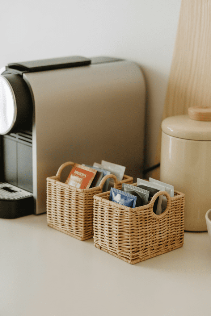 Keep only daily essentials visible. Store pods, packets, and backups inside a woven basket or cabinet so the surface reads calm.