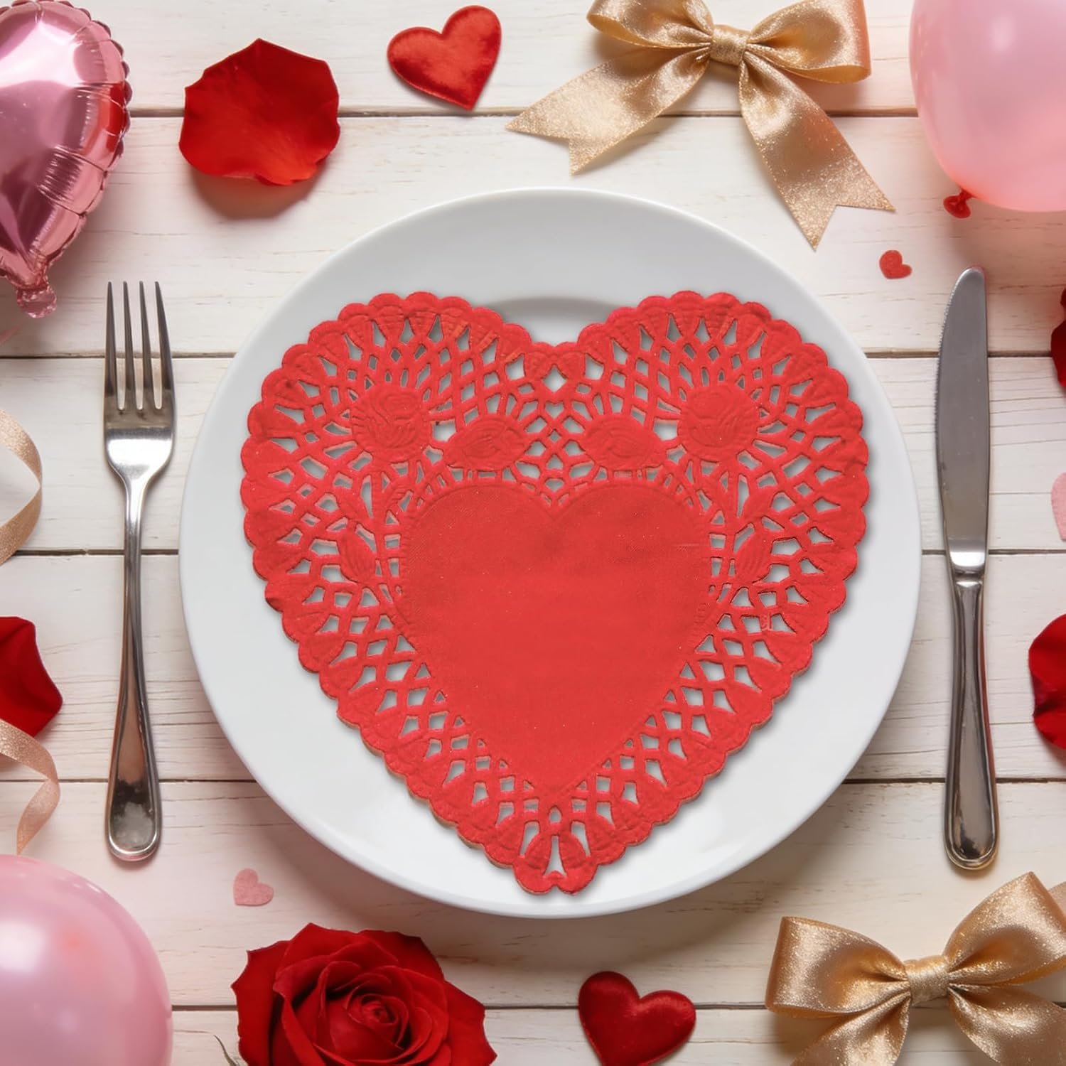 Heart-shaped doilies add a delicate, romantic layer to table settings, trays, and candle displays.