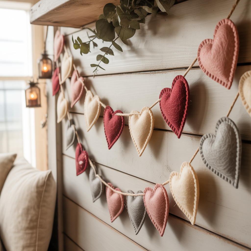 A soft felt heart garland instantly adds warmth and charm to walls, mantels, and shelves while keeping a handmade, relaxed feel.