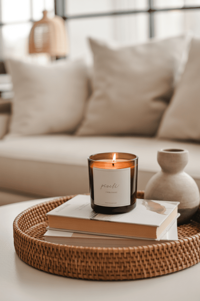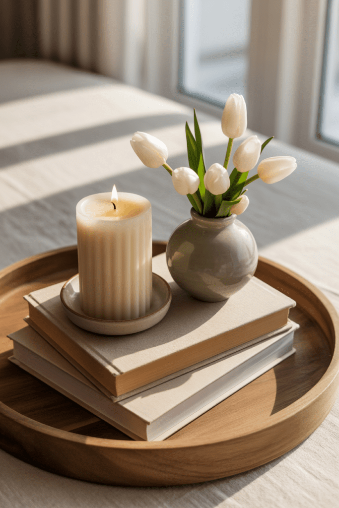 A decorative tray organizes candles, books, and small decor pieces. It creates structure, making your setup feel intentional instead of cluttered.