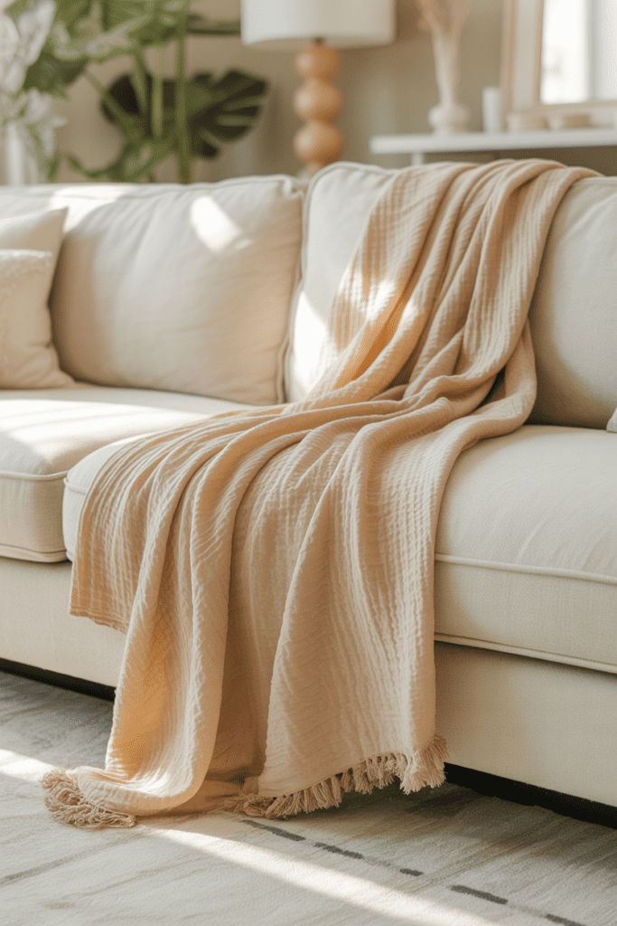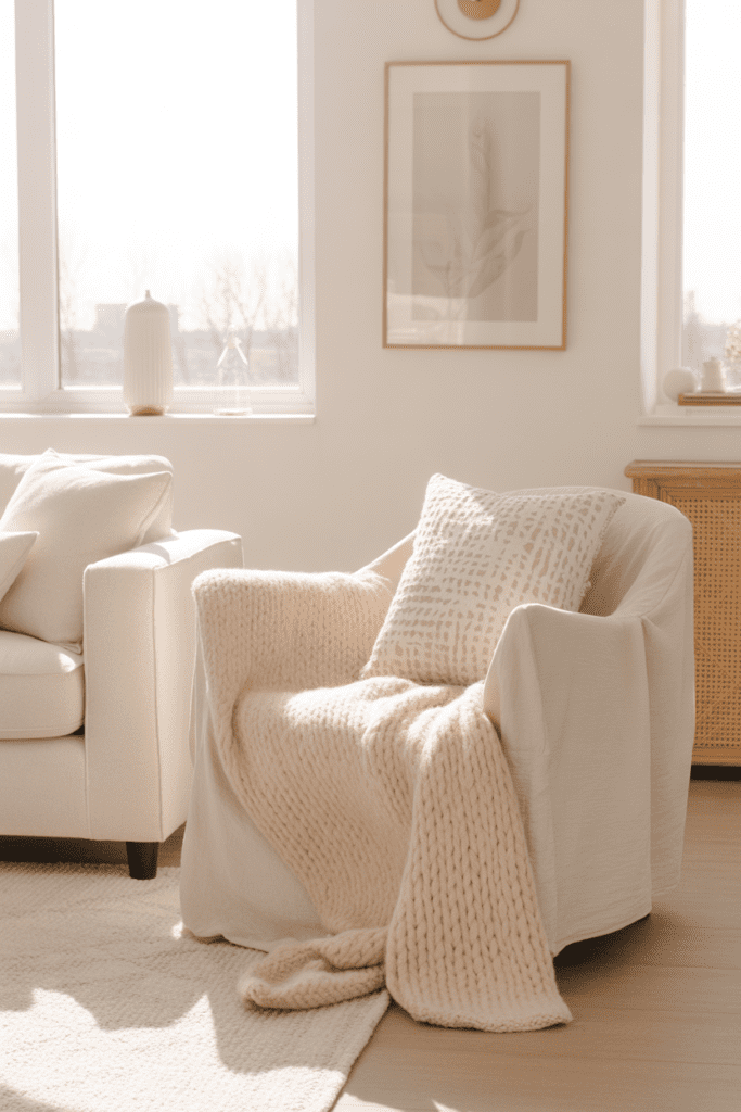 Layering a soft neutral throw over a chair or ottoman adds visual softness and warmth.