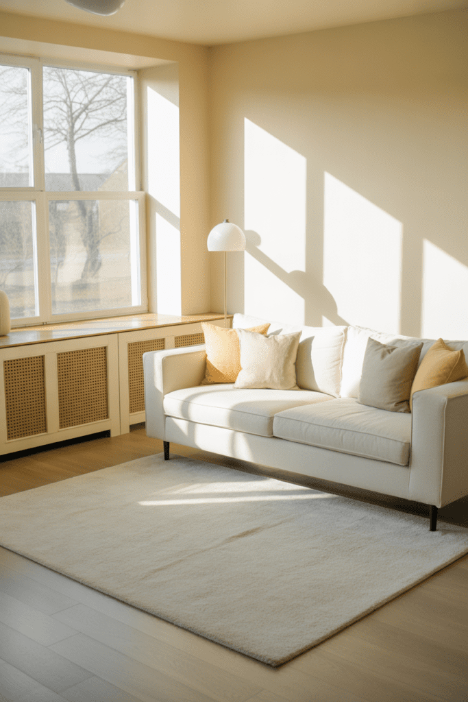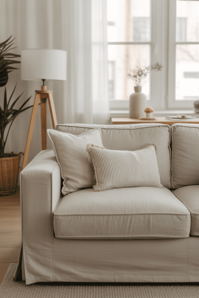 In the morning, when sunlight hits the slightly textured fabric, it adds dimension without visual weight. It’s a small upgrade that makes a big difference — perfect if you’re decorating on a budget and want your living room to feel fresh and light.