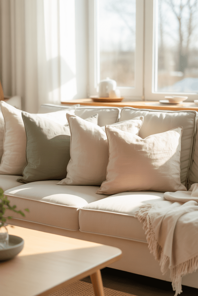 Swapping heavy winter pillows for linen or cotton-blend covers instantly elevates the space. Choose shades like soft sage, creamy white, pale blue, or muted blush. The natural texture looks far more expensive than it costs and creates that relaxed, designer feel.