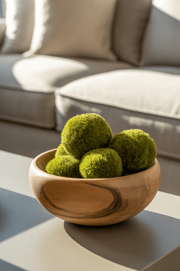 Wooden or ceramic bowls add depth to coffee tables and consoles. Fill them with moss balls or leave them empty for a minimalist look.