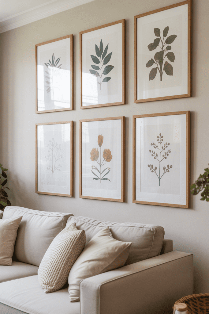 Soft greens, beige tones, and delicate floral sketches create calm visual flow. Paired with thin wood or matte black frames, the look feels curated and high-end.