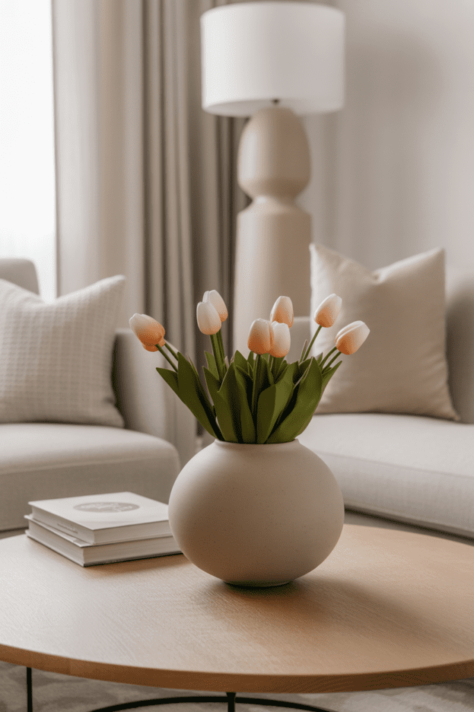 A matte ceramic vase filled with faux tulips, eucalyptus, or cherry blossoms instantly brightens your living room.