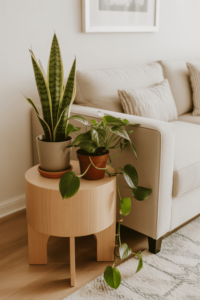 Nothing makes a living room feel fresher than greenery. Affordable snake plants, pothos, or even realistic faux olive branches can completely shift the mood of a space.