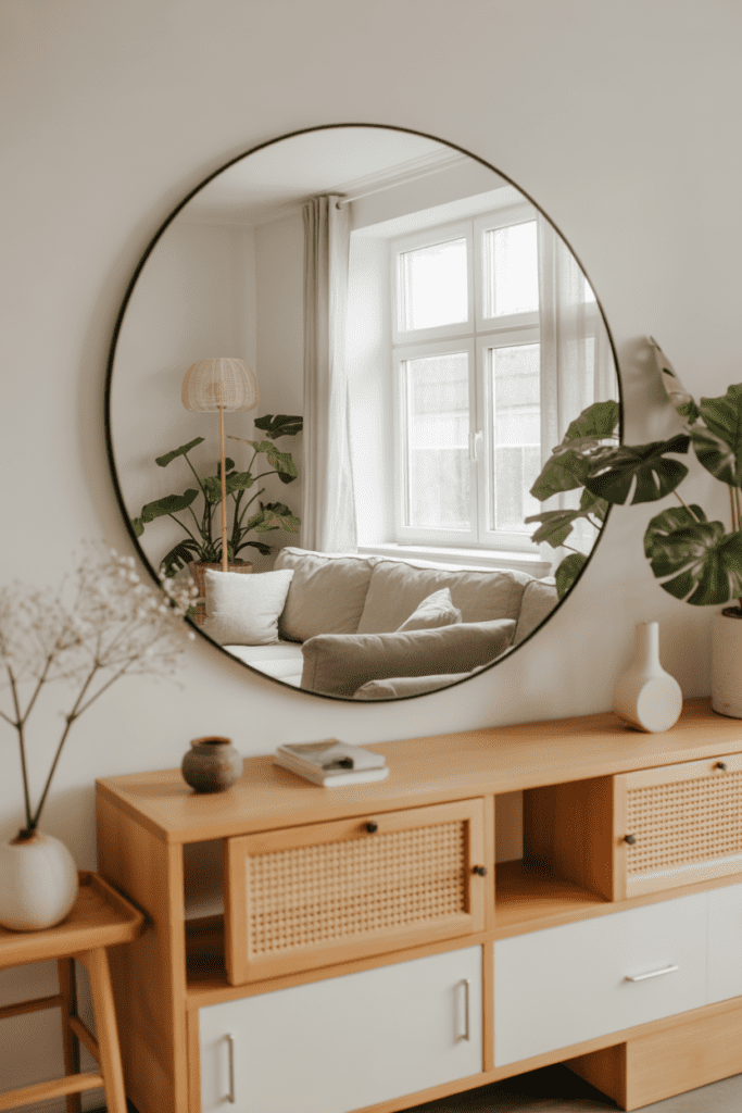 Mirrors amplify natural light and create the illusion of more space. A simple round or arched mirror instantly elevates a blank wall.