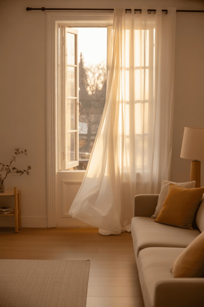 Replacing thick winter drapes with sheer white or ivory panels instantly transforms your space. Sheers allow natural light to filter through gently, creating a soft glow that fills the room.
