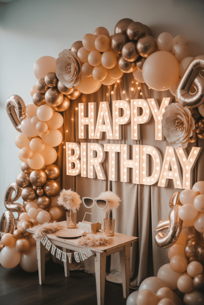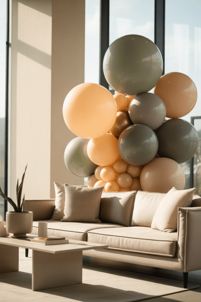 Instead of a large, overwhelming balloon arch, try a clustered arrangement in 2–3 muted tones. Matte balloons instantly look more refined and photograph beautifully.