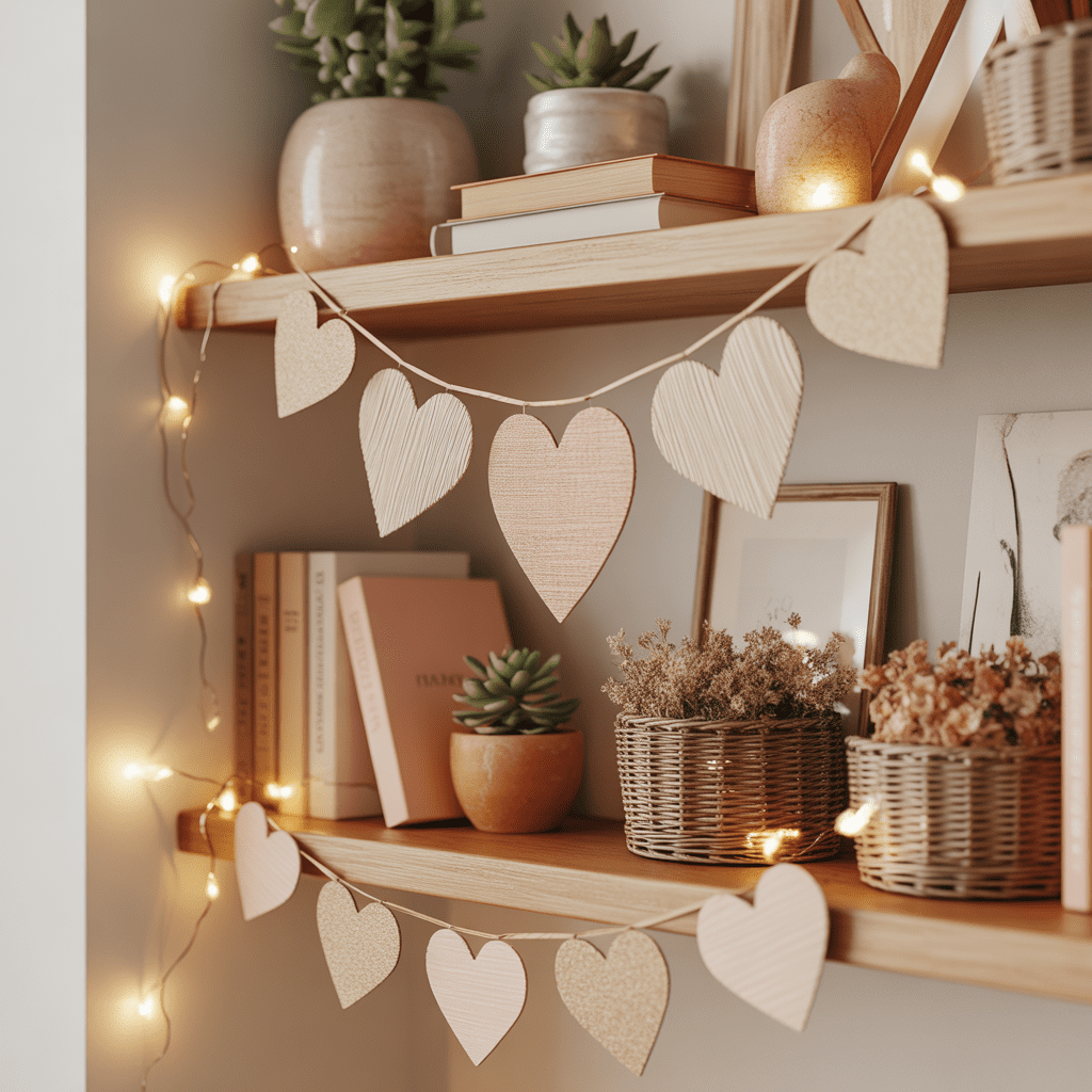 Shelves and small spaces are perfect for adding subtle Valentine touches. Handmade decor pieces, framed prints, and soft textures help create moments of warmth throughout the home. These small details add romance without overwhelming the space, making them ideal for apartments and minimalist interiors.